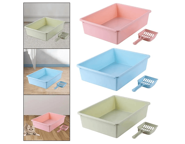Este versátil arenero está disponible en cinco atractivos colores: rosa, celeste, gris, marrón y negro, lo que te permite elegir el que mejor se adapte a tu estilo y decoración. Además, como un bono especial, ¡incluimos una pala de regalo con tu compra! Ten en cuenta que la pala se enviará en un tono aleatorio similar al arenero que elijas.