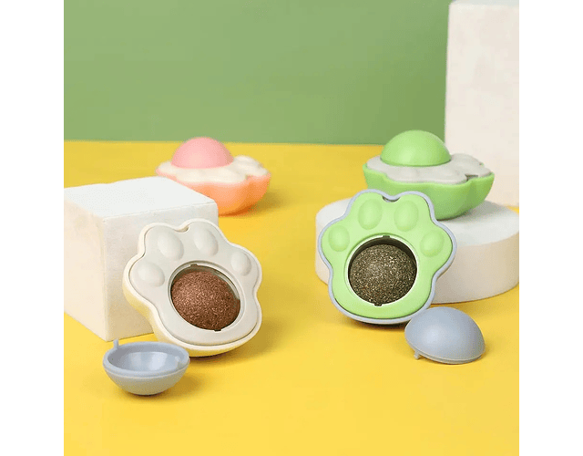 Espectacular merienda para gatos, esta bola de hierba gatera mas su base pegable en forma de patita permitirá atraer a tus gatos para que la laman, haciéndolos felices y libres de ansiedad.