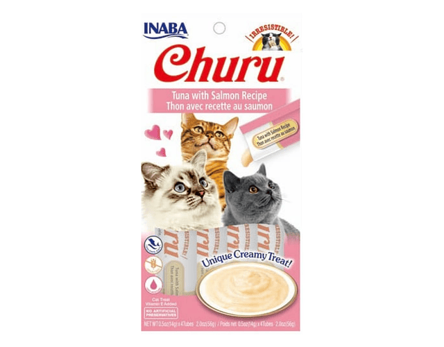 32Estas golosinas para gatos están hechas con atún y salmón. Churu tiene un alto contenido de humedad que los felinos necesitan para la salud. Simplemente abra un tubo y apriételo un poco para alimentar a mano estas golosinas sin cereales ni conservantes. También puede verterlos en un plato o usarlos como aderezo sabroso en alimentos húmedos o secos.