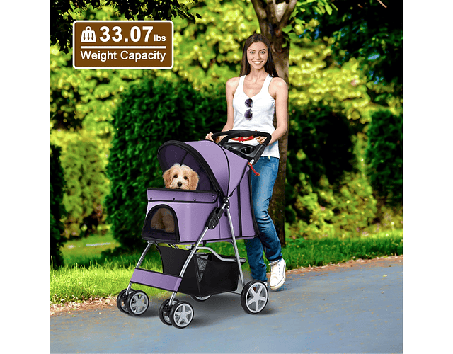 Imagina poder llevar a tu fiel compañero a todos tus lugares favoritos, desde parques hasta tiendas, sin esfuerzo y con total tranquilidad. Con nuestro coche carro mascotas, eso es exactamente lo que obtienes. Equipado con un mango ergonómico que garantiza un agarre cómodo y seguro, podrás maniobrar fácilmente a tu mascota en cualquier dirección que desees. Además, los frenos seguros en las ruedas traseras te brindan un control total sobre el movimiento del coche, ofreciendo una experiencia de paseo sin igual.
