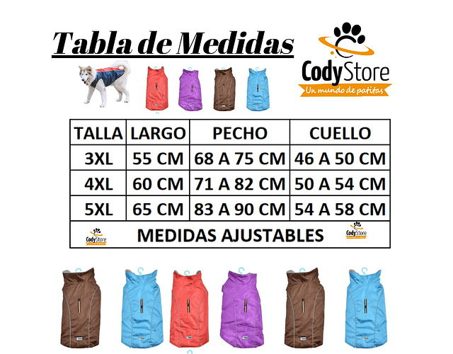 - Talla 3XL: Largo: 55 cm, Pecho: 68-75 cm, Cuello: 46-50 cm